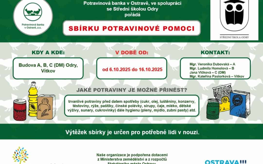 Potravinová banka v Ostravě ve spolupráci se Střední školou Odry pořádá sbírku potravin a hygienických potřeb.